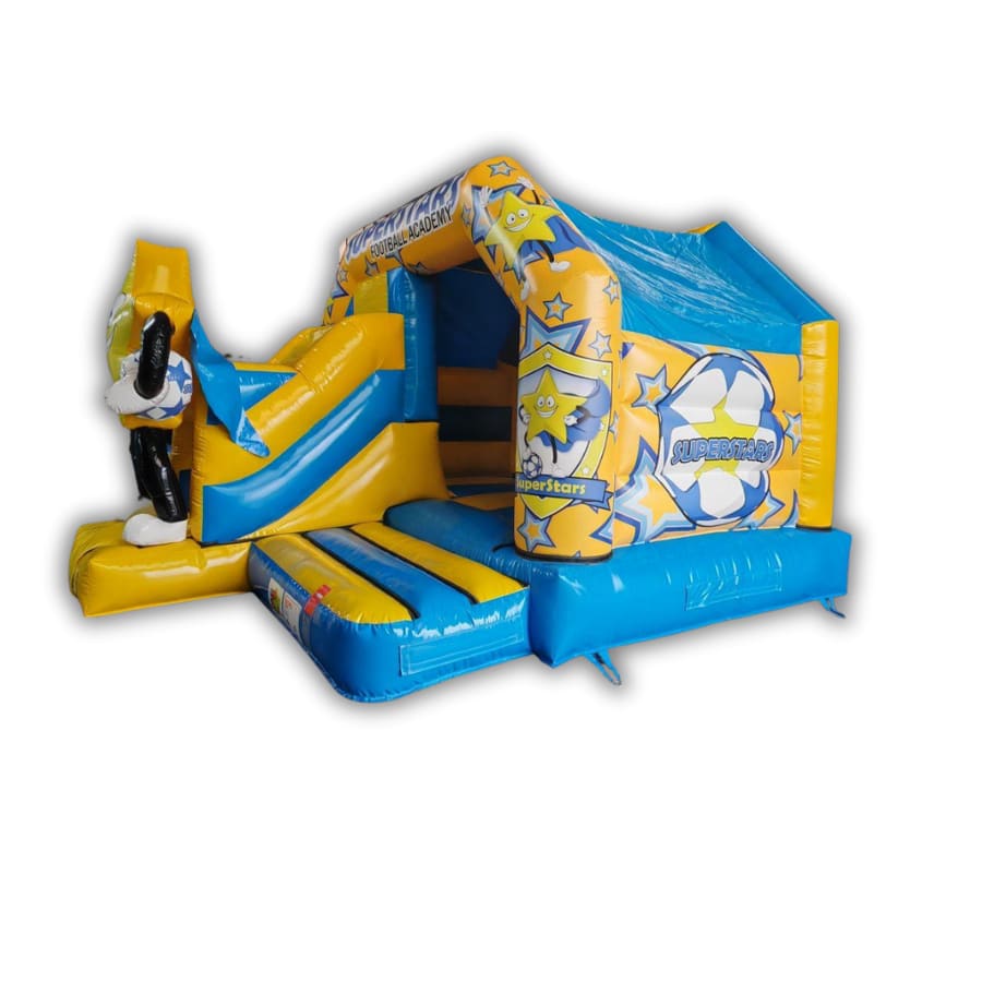 💙 Striking blue and yellow SuperStars theme 🏰 12ft x 15ft – a compact unit packed with fun 🛝 Built-in slide for added excitement ☀️ Covered roof for all-weather play 👦 Suitable for children aged 3–10 ✅ PIPA-tested, insured, and HSE-compliant 🚚 Professional delivery, setup & collection included